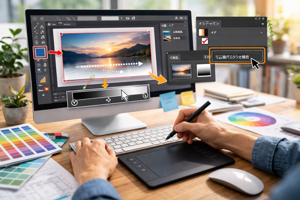 この記事では、イラレで写真にグラデーションをかける基本手順から、自然に見せるコツ、うまくいかないときの見直し方まで、初心者の方にもわかりやすくまとめました。