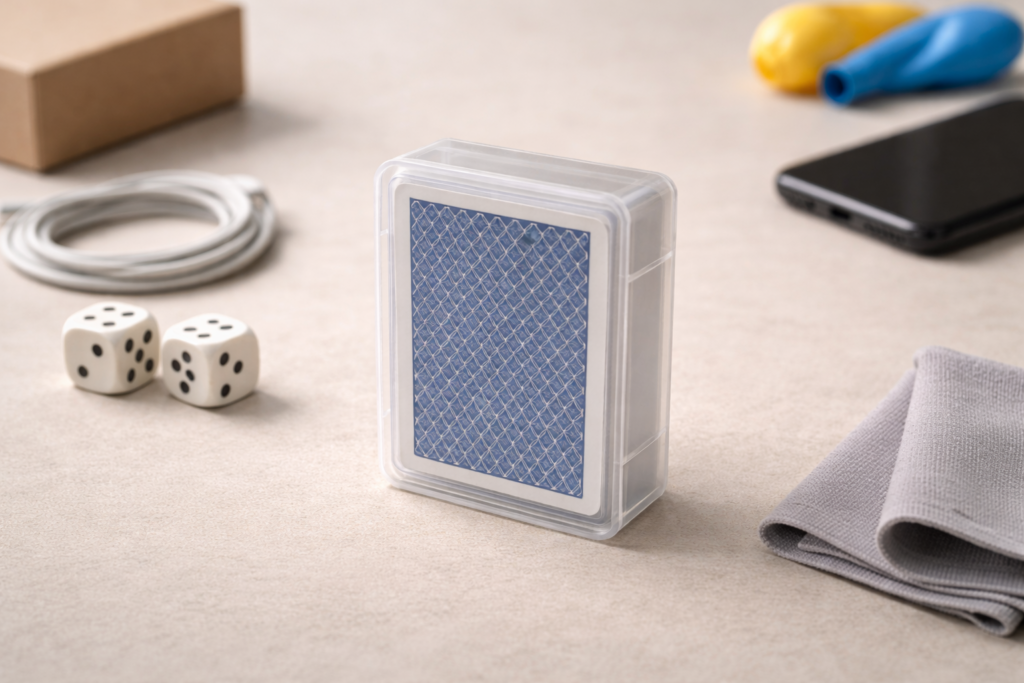 今回の目的は「プラスチック製のトランプ」なので、透明や半透明のケースに入っているタイプが目印になりやすいです。
