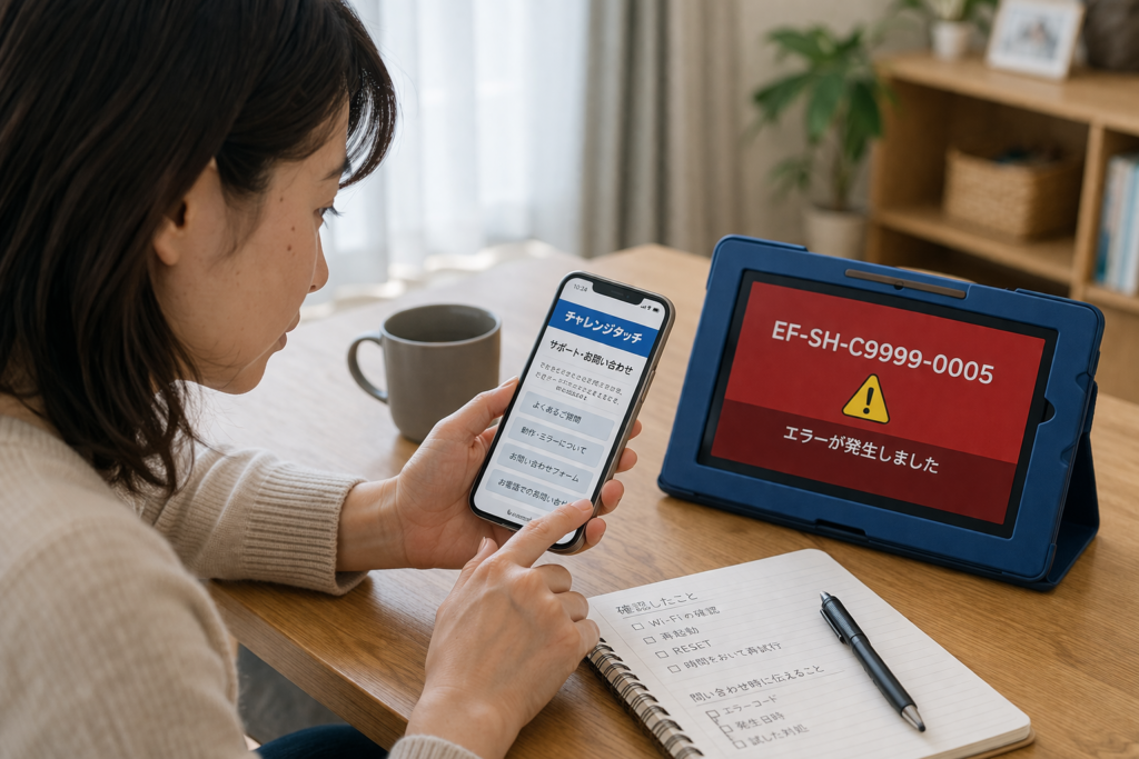 チャレンジタッチにEF-SH-C9999-0005が表示されると、「壊れたのでは」と一気に不安になりますよね。