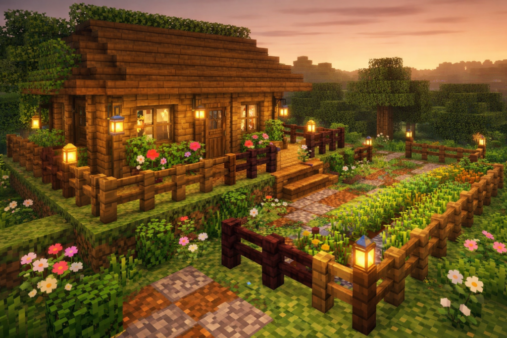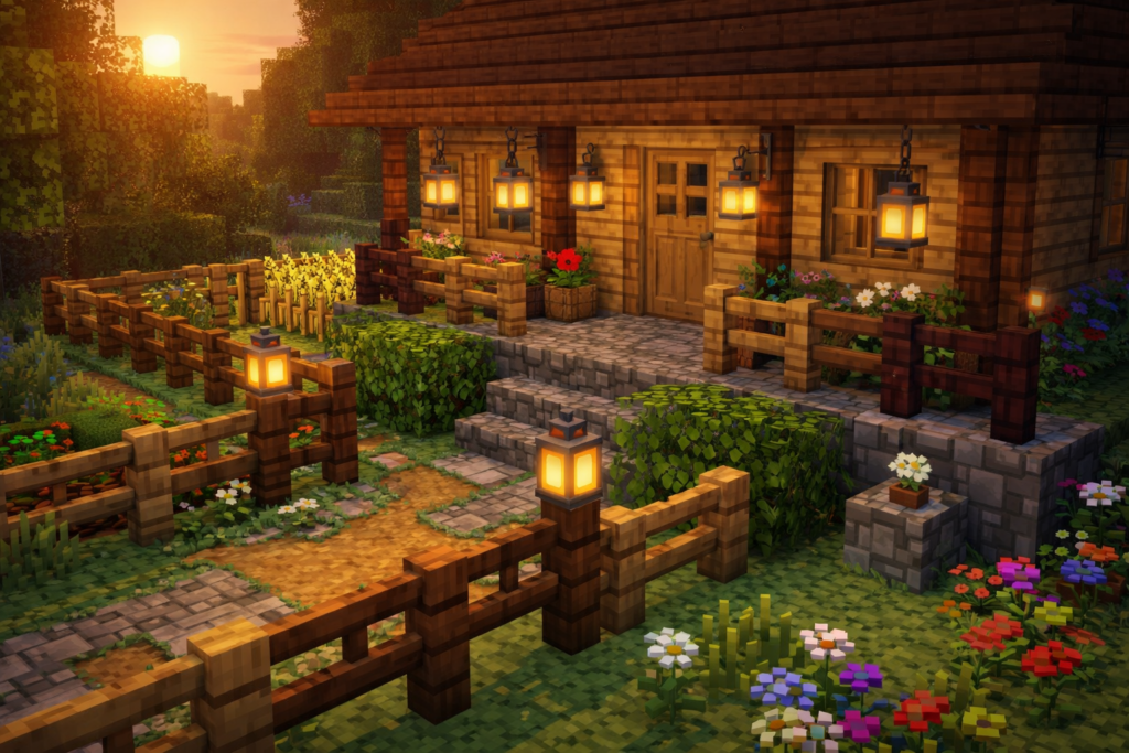 フルブロックだけで作った家は少しのっぺりしやすいですが、フェンスを加えると抜け感が生まれます。