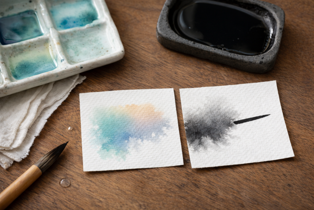 水彩と墨は、似ているようで動き方が違うからこそ、組み合わせると表情がぐっと増えます。