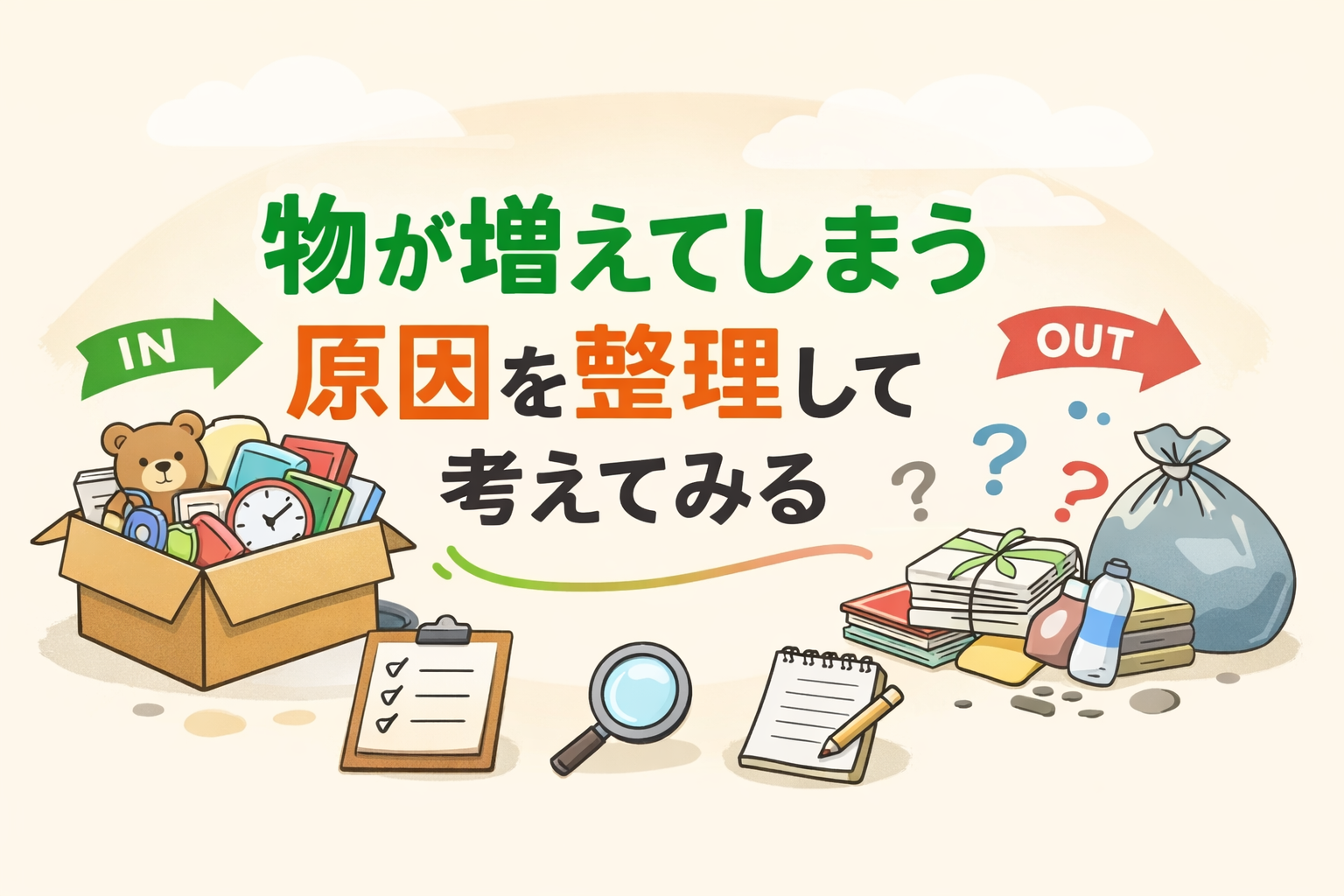 ここでは、物が増える原因をできるだけ分解して、誰でも見直せる形に整理します。原因が見えると、対策も「頑張る」ではなく「仕組みを変える」に寄せられて、気持ちが少しラクになります。
