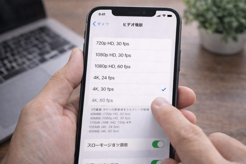 利用できる解像度やfpsは機種によって異なりますが、Appleは対応モデルでHDや4K、24・25・30・60・120fpsなどを案内しています。