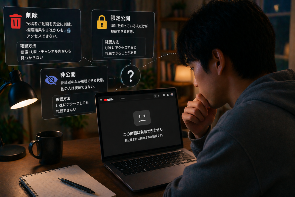 - 削除・限定公開・非公開は意味が異なるため、状態を切り分けて考える必要があります。