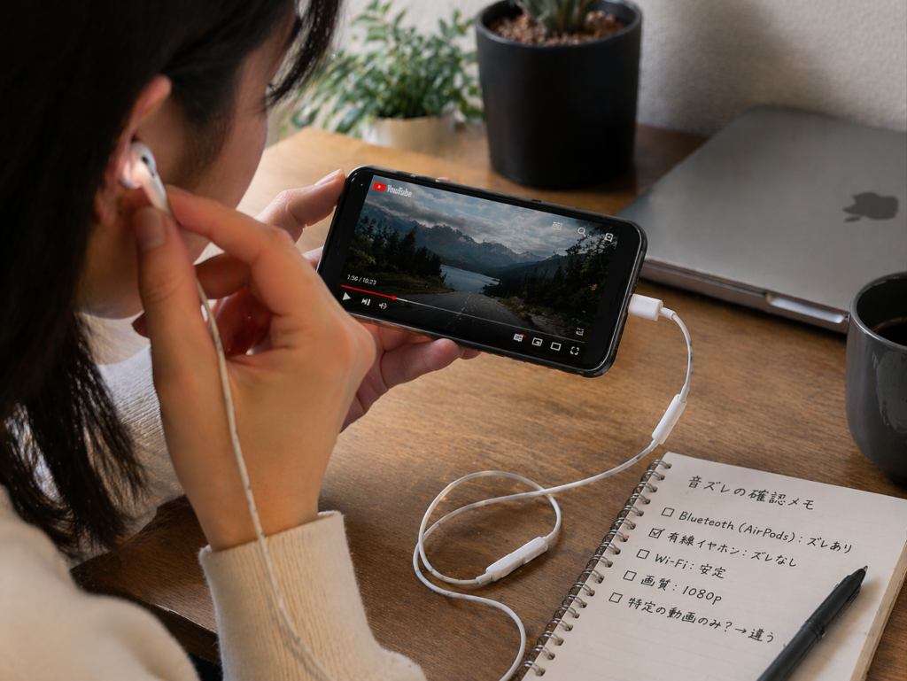 同じiPhone、同じ回線、同じイヤホンで、ある動画だけ毎回ずれるなら、端末よりも動画側の可能性が高いです。