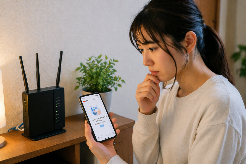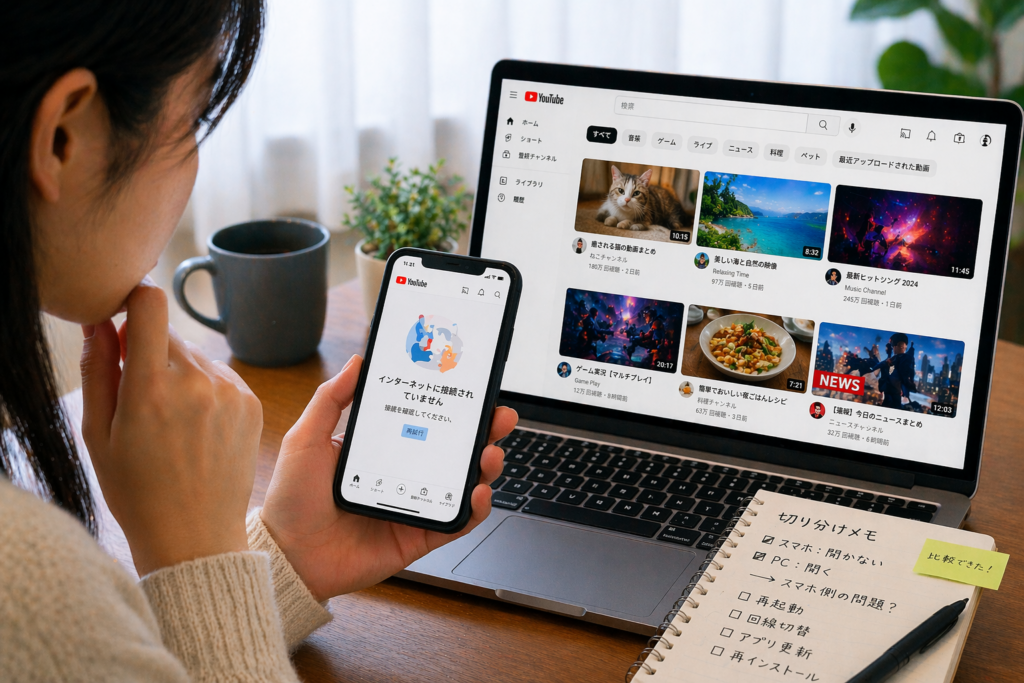 | アプリもブラウザも開かない | 回線障害、YouTube側障害、アカウント制限 | 回線切替、障害確認、別アカウント確認 |