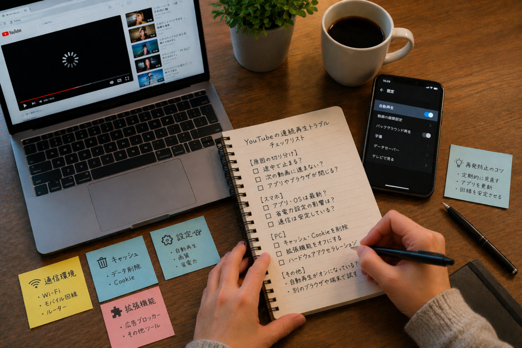 YouTubeの連続再生が止まるときは、やみくもに設定を変えるより、まず症状の種類を切り分けることが最短解決につながります。